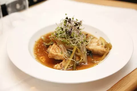 メインの魚と野菜の甘酢煮込み。カジキを使い、中華風に仕上げている。