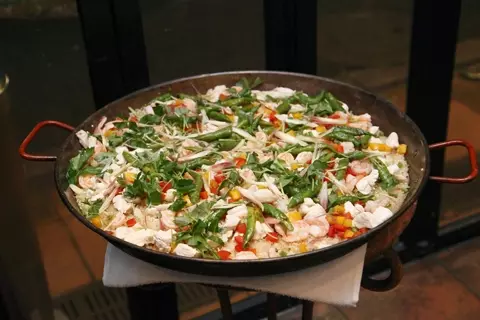お食事の「おいしくごはん」を使ったパエリア。お好みで、薬膳のカレーソースをかけて。