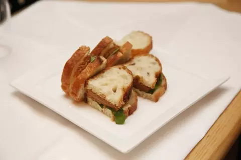 サプライズアミューズのベジカツサンド。大豆でできたカツを挟んでいる。