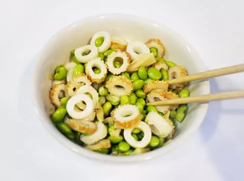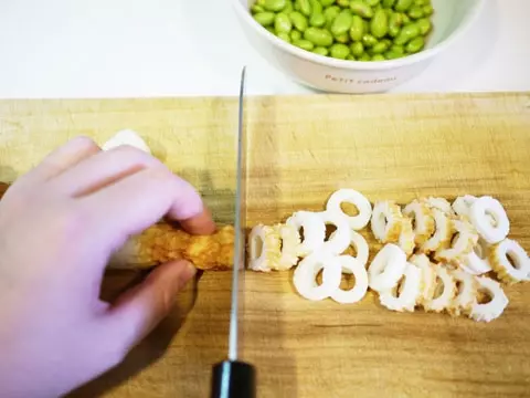 3、ちくわは3mmくらいの輪切りにします。枝豆は冷めたら豆を取り出します。