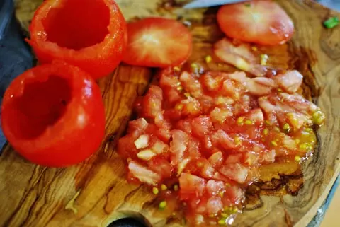 1、トマトはヘタのほうを切り、中身をスプーンでくり抜く。くり抜いた中身は粗みじん切りにしてボウルに入れる。