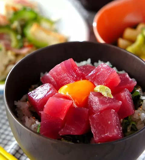 酢飯の上にオクラと合わせたモロヘイヤ、マグロをのせて。卵黄をからめながら召し上がれ!