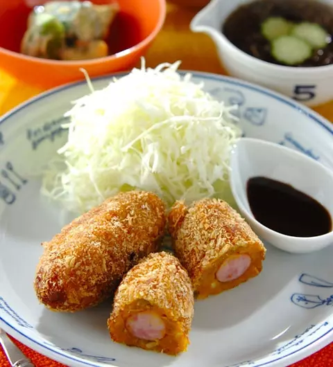 カボチャのコロッケの中にソーセージが! 食べごたえのある一品です。