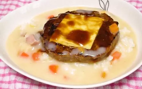 最後にこちらも温めたシチューをかければ「簡単お手軽ハンバーグドリア」のできあがり!