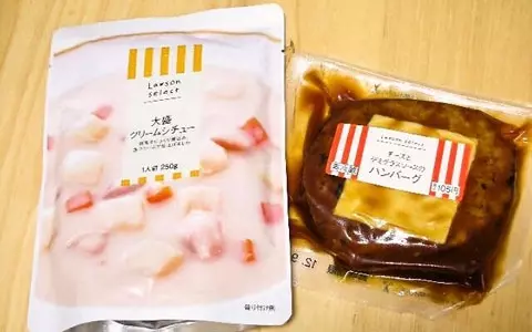 今回アレンジに使うのはローソンで購入できる次の食品。「ローソンセレクト 大盛クリームシチュー(¥118)」と「ローソンセレクト チーズとデミグラスソースのハンバーグ(¥105)」の2つと、炊きたてのご飯があれば準備完了。