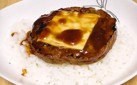 作り方は簡単。まず少し深めの食器にご飯をよそい、そこに温めたハンバーグをのせる。