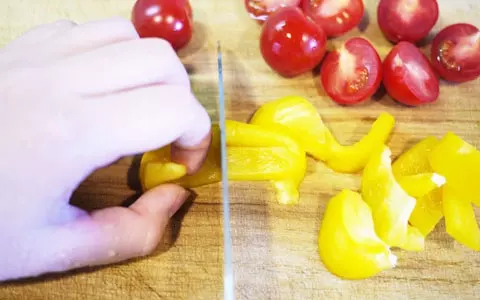 3.トマトとパプリカは食べやすい大きさに適当に切ります。ニンニクはみじん切りにしておきます。