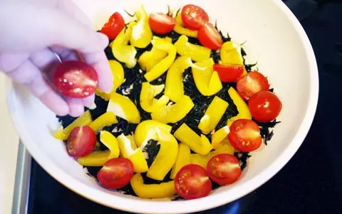 6.火を止めて同じフライパンにひじき→パプリカ→トマトの順番で入れていきます。トマトは中心をあけるように入れ、終わったら火をつけます。