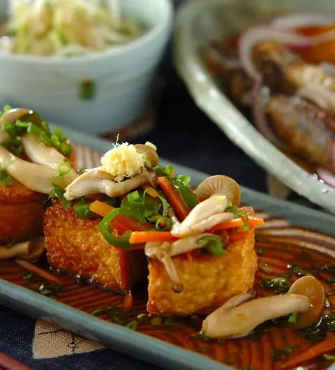 カリッと焼いた厚揚げに、野菜たっぷりのだしをかけていただきます。