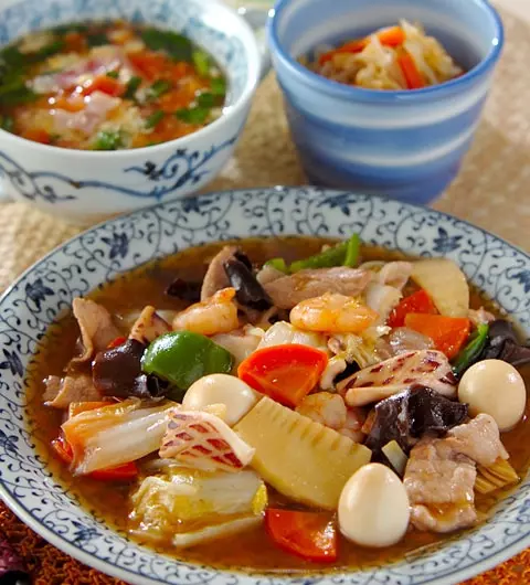 八宝菜は下準備をしっかりしておくと、グンと作業効率がアップします。スープはトマトを加えてサッパリと。