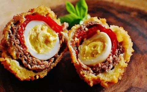 コロンとしたかわいらしいコロッケ。割ってみれば・・・まさにお月見!ジューシーな肉に、トマトの酸味。うずら卵がピッタンコだ。