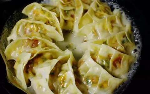 ホタテは、しっかり汁気を絞って入れよう。そのかわり、旨みが残った汁を焼く時の蒸し汁に再利用するのがポイントだ。(もし皮から手作りする場合は、このホタテの汁を生地に練りこむともっと美味しいよ)
