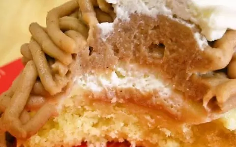 容器から取り出すとまるでケーキ屋さんで買ってきたような見た目のモンブラン。タルト生地の土台の上にカスタードクリーム、生クリーム、モンブランクリームが3層に重ねられていて、その頂点にはつやつやに光る栗がのせられ、見た目にも華やかな仕上がりだ。