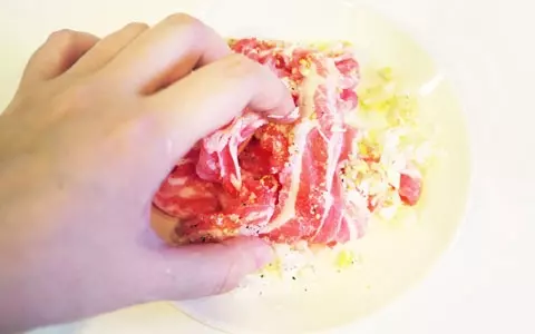 5.ネギ塩豚焼き用の豚肉に、みじん切りにしたネギ、おろしニンニク、塩、ゴマ、ゴマ油を加えて、よく揉み込んでおきます。
