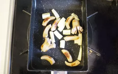 6.卵焼き器か、なければ適当なフライパンにキャベツの芯と全てのウインナーを加えて焦げ目がつくまでよく炒めます。終わったら一度全てを取り出し、火を止めます。取り出したサラダ用ウインナーとキャベツは熱いうちに寿司酢と粉チーズで味をつけておきます。