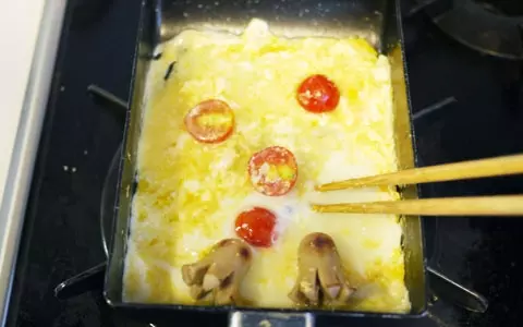 7.再び火をつけて、ミニトマトを少し炒めたあとタコウインナーを戻し入れます。弱火にして、事前に塩と粉チーズを加えて軽く混ぜた卵液を流します。