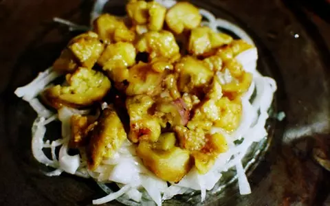 5.玉ネギは10分ほど水にさらしてしっかり水気をしぼり、皿に敷く。その上に4を並べ、残った漬け汁も上からかける。
