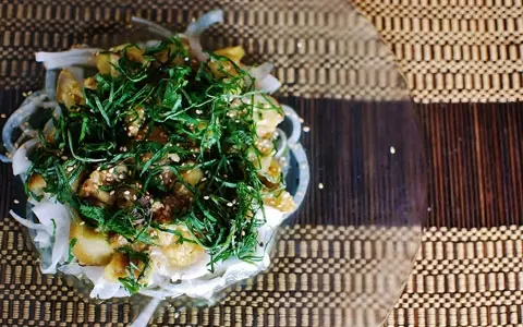 6.大葉をのせ、白ゴマをふり、仕上げ用のごま油をまわしかけて完成!