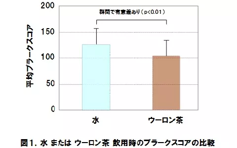 結果、水摂取の場合は126、ウーロン茶摂取の場合は104と、ウーロン茶を飲用すると、水に比べてプラークの沈着が少ないことが明らかに。