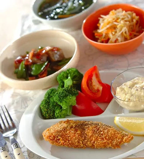 タルタルソースはピクルスや漬け物を加えたり、アレンジは自由自在。副菜は板コンニャクを使ってヘルシーに。