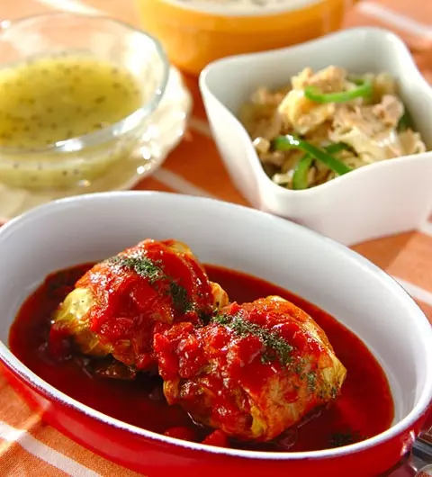 今日の献立は「トマト味のロールキャベツ」を含めた全4品。