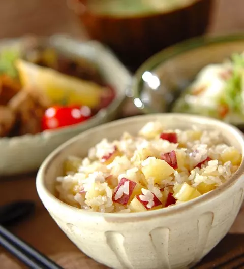 今日の献立はサツマイモがおいしい季節、もち米入りの「サツマイモご飯」