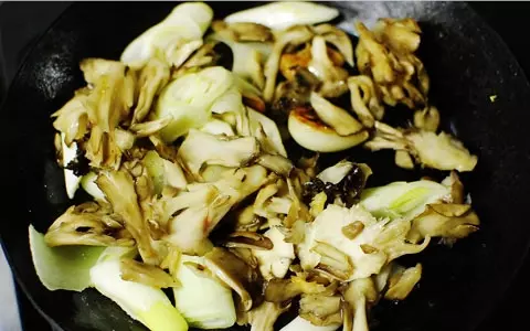 4.サンマに焼色がついたらいったん取り出す(中まで火を通さなくてOK。にんにくも取り出す)。同じフライパンに舞茸と白ネギをいれ、全体に塩を少々してさっと炒める。※サンマから出た脂で炒めるので、油はひかないでOK