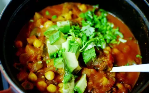 4.パクチーの軸の部分とアボカドをいれて火を止め、ざっと混ぜて器に盛る。