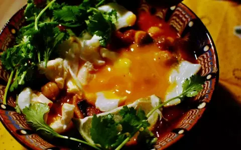 6.スープを器に盛り、5のポーチドエッグをのせパクチーの葉の部分を飾ってくし型に切ったライムをそえて完成!!