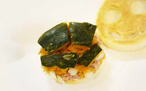 7.マッシュしたカボチャをのせて、カボチャの皮を顔の形をイメージさせてのせます。