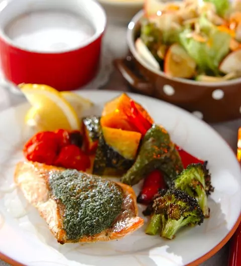 ソテーした生鮭と野菜をオーブンで焼いたシンプルな一品。レモンを搾って召し上がれ。