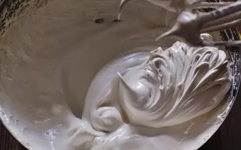 2、常に泡立てながら湯せんにかけ、指で触ってみて人肌くらいになったら湯せんからはずし、冷めるまでしっかり混ぜ続ける。ツヤが出て、ピンと張ったメレンゲになればOK。