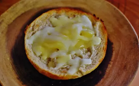 5、バンズは半分に切り、下になる面にシュレッドチーズをのせチーズが溶けるまでオーブントースターで焼く。