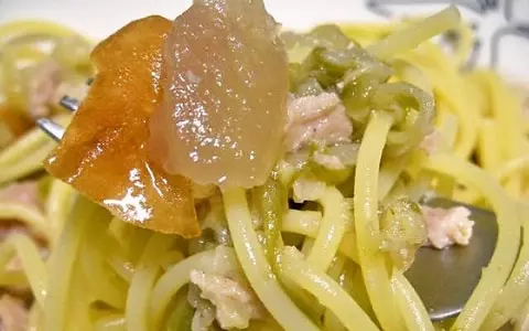 おでんの具材を細かく切っておでんのつゆと一緒に、茹でたスパゲティに和えるだけで出来上がりだ。