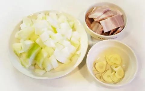 3.茹でている間にほかの材料を用意しておきます。たまねぎは粗めのみじん切り、ニンニクは輪切りにして爪楊枝などで中心の芽の部分を取り除きます。ベーコンは2cm幅くらいに揃えて切ります。ホールタイプのトマト缶の場合は適当に潰しておきます。食コラム記事ランキング