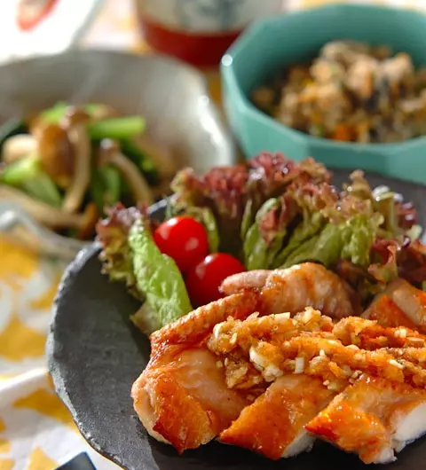 今日の献立は鶏もも肉の皮を上にして焼く事でパリッと仕上げた「おろしダレがけ塩焼き鶏」