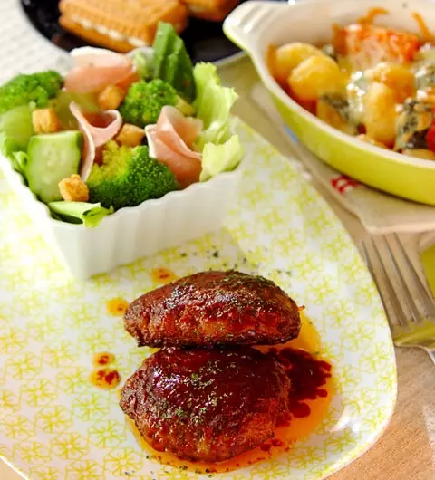 ハンバーグ、ニョッキ、サラダ……お家でレストラン気分が味わえます。ワインを添えてもいいですね。