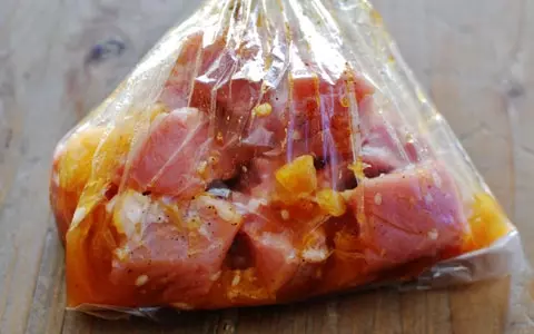 1、豚肉は2cm角くらいのサイズに切りポリ袋に入れる。そこに☆(※オレンジは果汁を絞り、絞って残った房の薄皮も一緒に入れる)を入れ30分~1時間ほど置いておく。