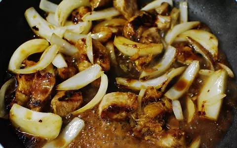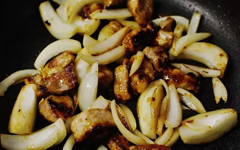 6、玉ねぎが透き通ってきたら4の蓋をあけ、ほとんど水分が無くなっているのを確認したら豚肉を玉ねぎのフライパンにいれる。
