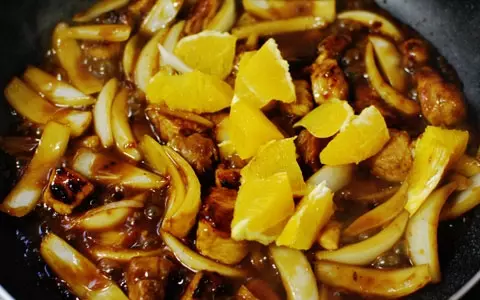7、3を入れ、全体を混ぜるように加熱する。豚肉についていた片栗粉のおかげで、徐々にとろみがついてくるので、十分なとろみがついたらオレンジをいれてざっと混ぜて火を止める。