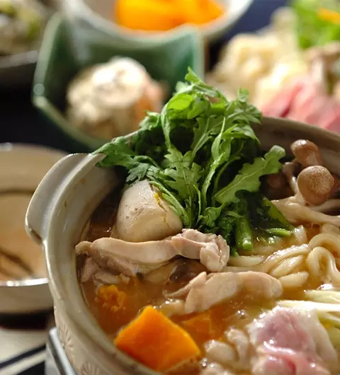 カボチャや里芋の入った、ほくほく食べるお鍋。お肉は豚と鶏を使って豪華に。