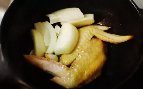 2、鶏手羽先に焼き色がついたら、玉ねぎを入れて炒める。全体に油が回ったら、酒をまわし入れる。