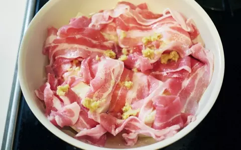 3. 豚肉をなるべく重ならないように広げてのせ、生姜とめんつゆも加えます。