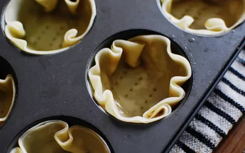 5.マフィン型に薄くオイルを塗り、4をタルト型になるように入れ、底にフォークで穴を開ける。180度に予熱したオーブンで10分ほど焼く。焼けたら取り出して冷ましておく。