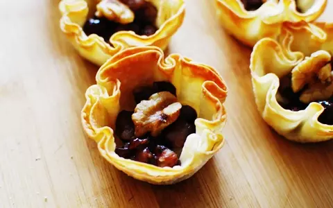 6.5のタルトにつぶ餡を小さじ1入れ、くるみを1つのせる。