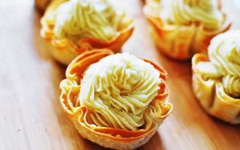 7.2のさつまいもペーストを絞り袋にいれ、6の上に渦巻状に絞り出す。