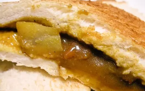パンを切るとごらんのように良い匂いのカレーが登場! 名付けて「カレーサンドトースト」!
