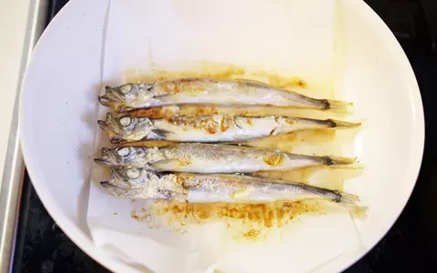 2.ししゃもは卵に火が通りにくいため、あらかじめ8~9割程度焼いておきます。魚焼きグリルで焼く方法でも良いですが、クッキングペーパーをフライパンに敷いてその上で焼く方法もあります。頭や尾が焦げにくく、均一に焼くことができます。