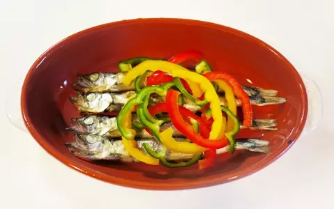 3.焼いたししゃもを耐熱皿に入れてパプリカをのせます。