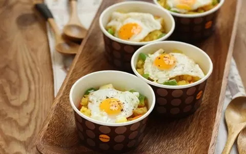 デザートカップは、100円均一に売っているもので充分。4~6個でセットになって売っています。人数分のカップに入れたら、うずらの目玉焼きを乗せて完成です。